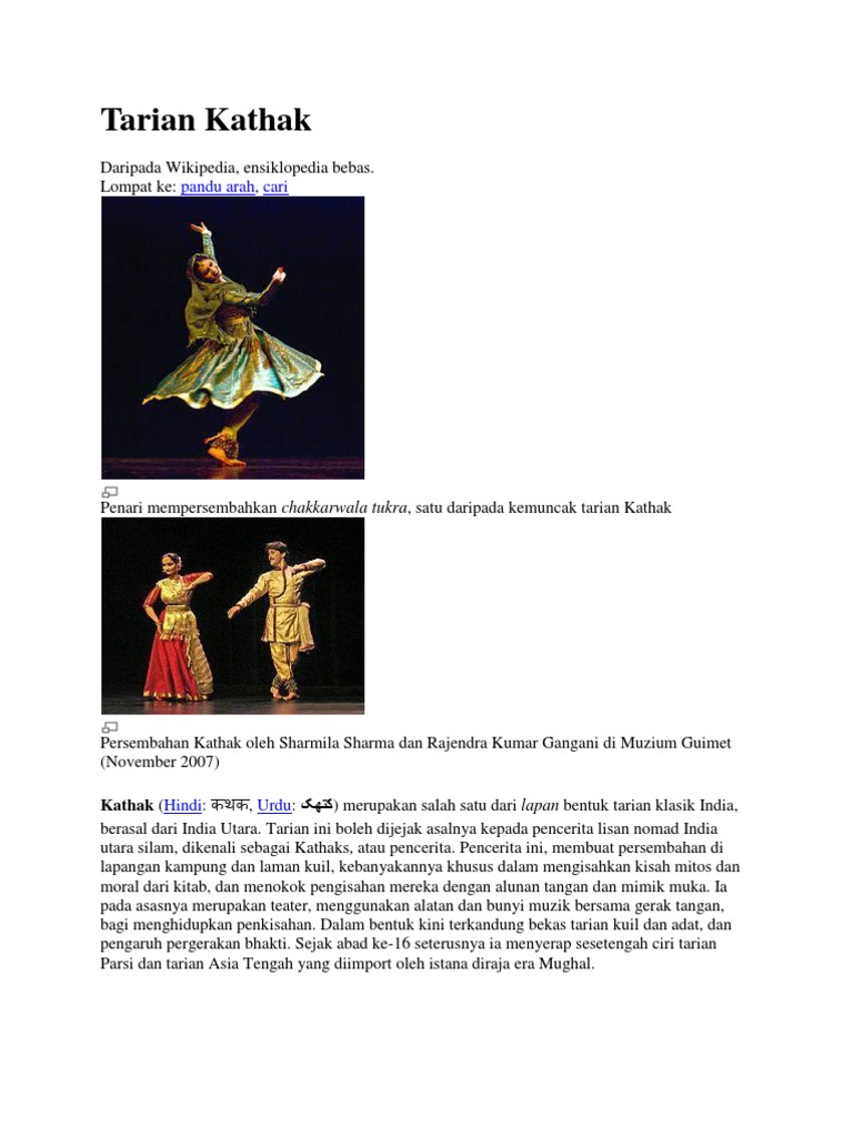 Perbandingan antara Kathak dan Kathakali Dance. Persembahan Kathak oleh Sharmila Sharma dan Rajendra Kumar Gangani di Muzium Guimet November 2007 Kathak Hindi. Bercerita tentang Kehidupan Agraris Suku Batak.
